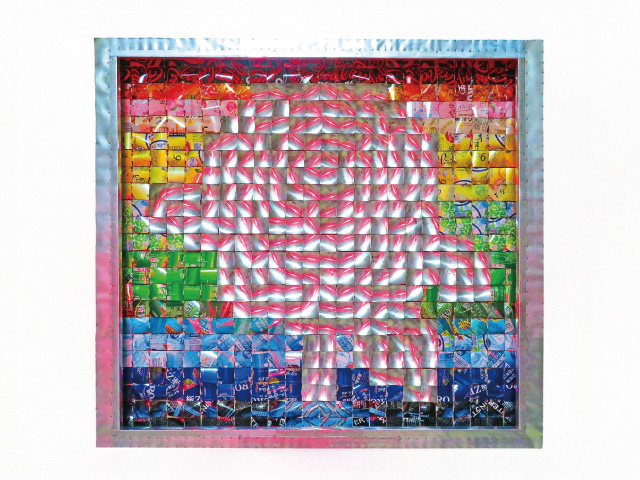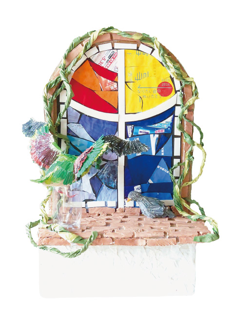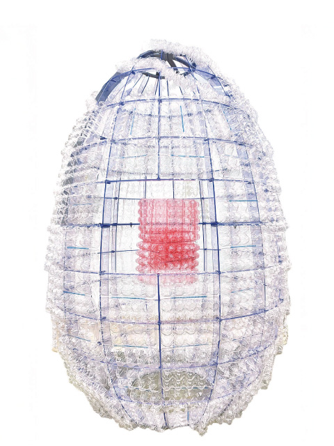 地域によってプラスチックのリサイクルのあり方に違いがある事の発見を発端に、環境に対して疑問を持った作品です。構造体と玉子ケースのアンバランスな対比が不思議です。