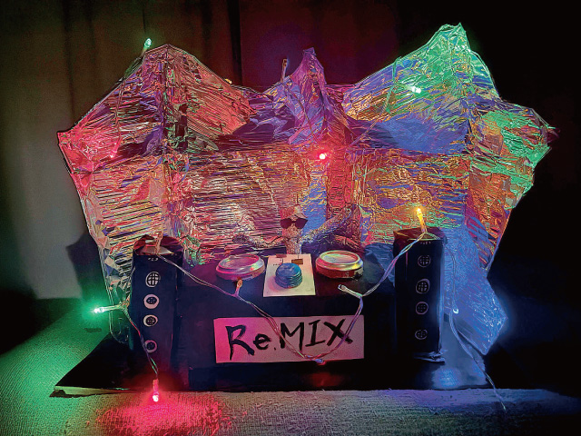 素朴な素材でパーティの混沌とした様子を表現してくれました。DJブースっぽさにこだわった、DJアートというなんとも理解しがたい不思議さが魅力の作品です。
