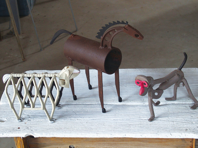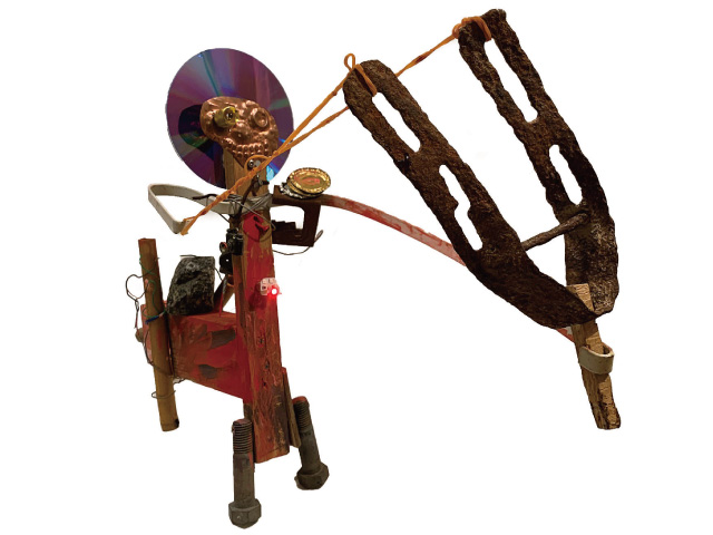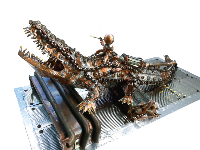 金属部品や機器類の廃材を再利用しメカニカルに表現されています。半田付けやビス留めなどを多用して、密度の高い造形に、見る側の心も躍るような作品です。