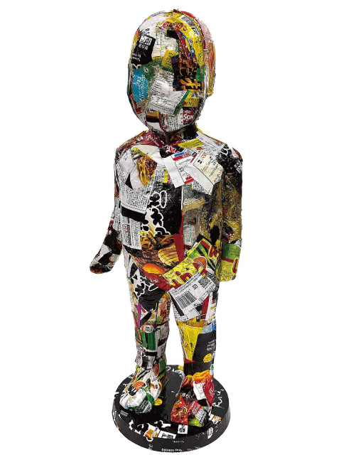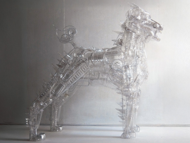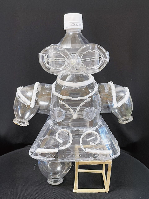 環境と共生し、未来を守る力になればと願い獅子が表現されています。ペットボトルの組み合わせを試行錯誤して透明な中に厚みのある形が力強く表現されています。