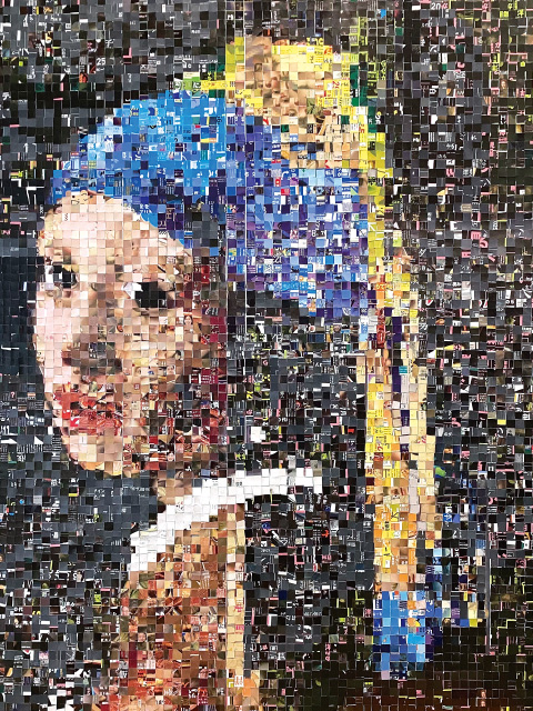 不用なチラシを2cm角にカットしたもの約6500枚使って制作してくれました。微妙な色合いの再現の為に最適なピースを探し出す努力が報われました。