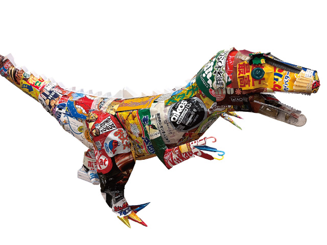 大好きな恐竜が、お菓子の入れ物を食べて地球を救ってくれました。どこに何のお菓子の入れ物使うかを工夫したそうです。動きや表情が魅力的な作品です。