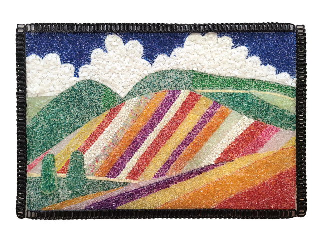 大好きな美瑛町の丘の景色を、ペットボトルをパンチしてトースターで焼いた丸い破片とリングプルで作ってくれました。宝石のような美しさが魅力的です。