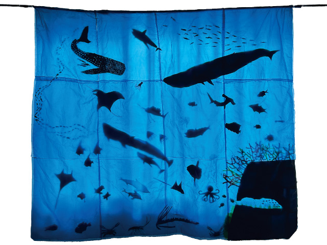 竜宮城の窓から見た海の中の景色を、光を通さない材料を選んで表現してくれました。制作物をシルエットで見せるという、実は裏面が魅力な作品です。