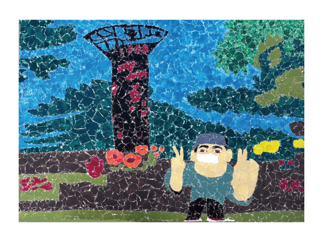 はじめは部門を間違えて応募したのではと思った作品でしたが、見ているうちに素直な表現と構図、色使いと丁寧な仕上げに心惹かれた作品でした。卵の殻に色をつけ、綺麗に貼り付けたこの作品はとても素朴で印象に残った作品です。